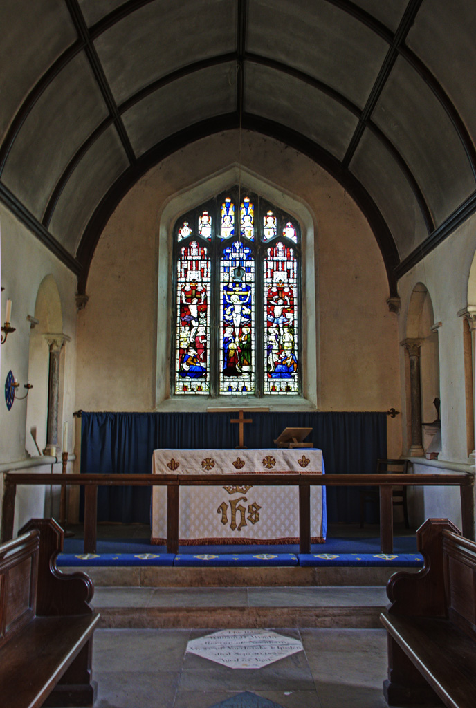 The oldest part of the present building is probably the North Chapel, almost certainly that upland chapel. There is a powerful small modern stained glass window in the west wall of the chapel.