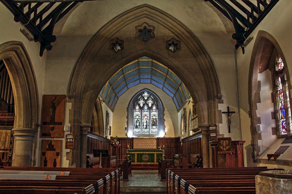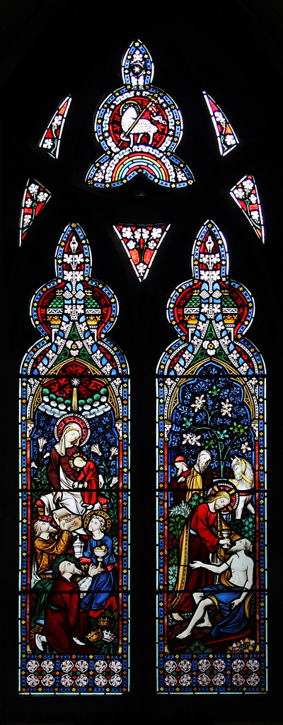The window to the right of the altar is medieval Flemish set between Victorial diamond panels. The saint/bishop is unidentifiable (and perhaps unidentifiable) and it is not thought to be original to this Church.