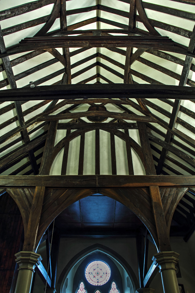 The fine medieval roof timbers over the main body of the church were revealed in 1857 and prove how very wide the old Church was. However, the timbers over the north aisle (nearest the main church door) were new; notice how comparatively regular they are. The space now occupied by the north aisle had once contained two chantry chapels and, later, the village school.